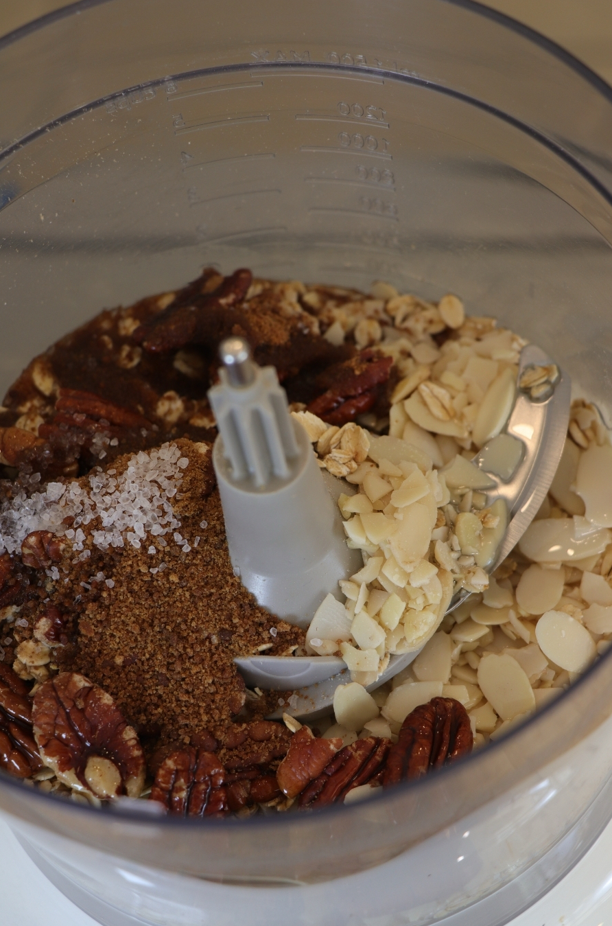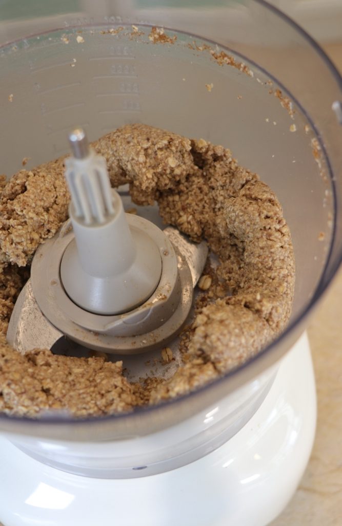 - ضعي الشوفان، اللوز، البيكان، سكر جوز الهند، والملح في محضّرة الطعام، واطحني على سرعة عالية حتى يصبح الخليط ناعمًا كالدقيق.