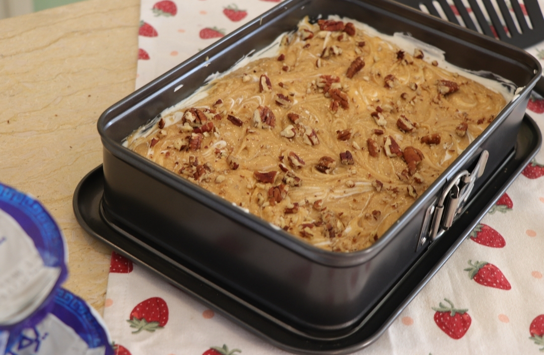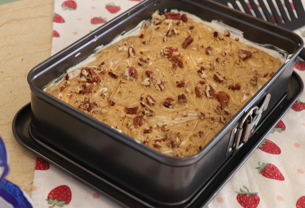 - اسكبي خليط التشيزكيك فوق القاعدة المخبوزة بالتساوي.
