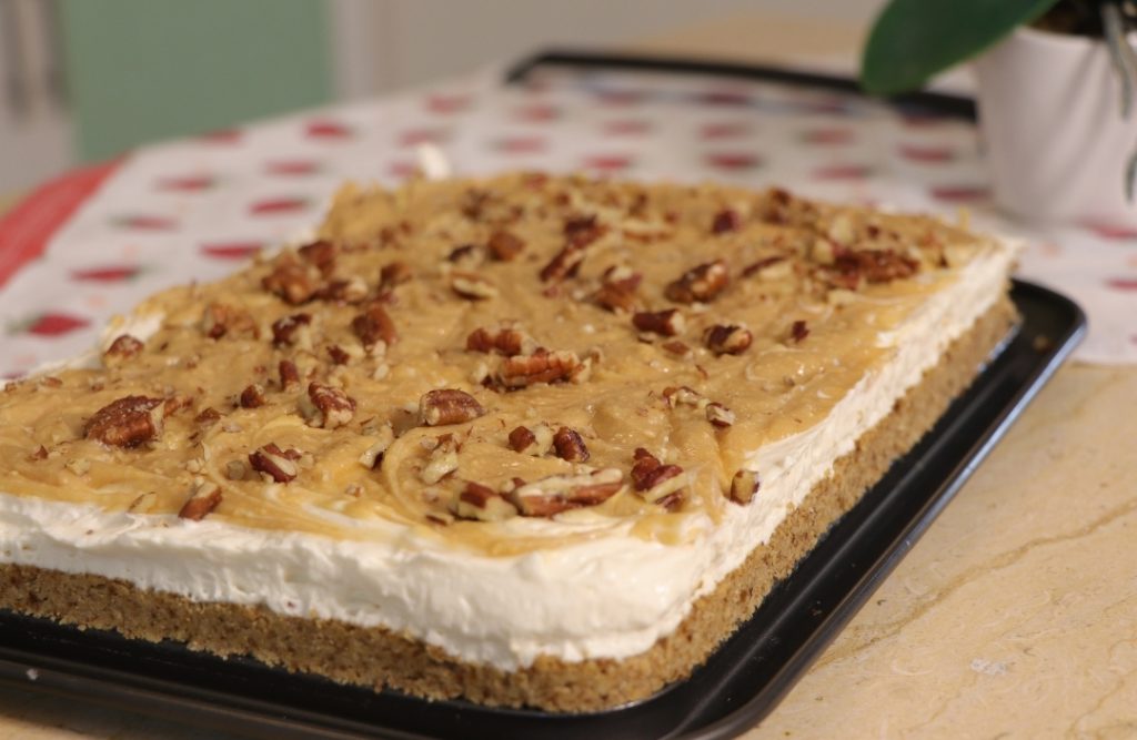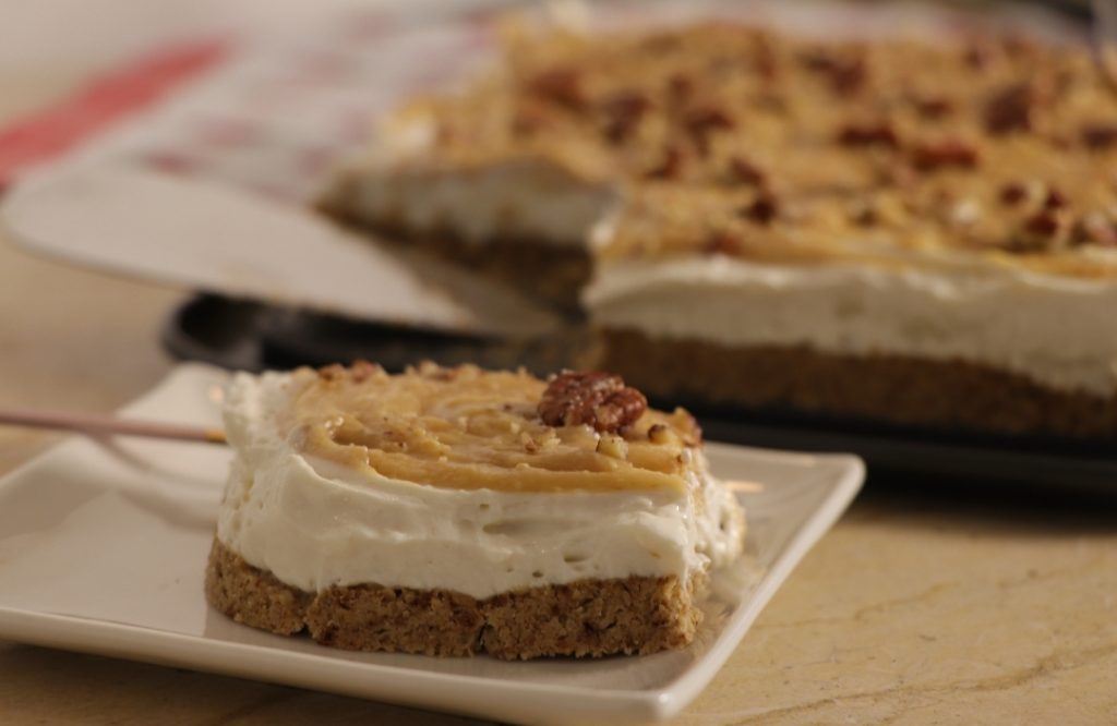 تشيزكيك بقاعدة خالية من الغلوتين، محضّر بمكونات طبيعية، يجمع بين القرمشة الخفيفة، القوام الكريمي، ولمسة كراميل مملّح لذيذة بدون سكر مكرر.